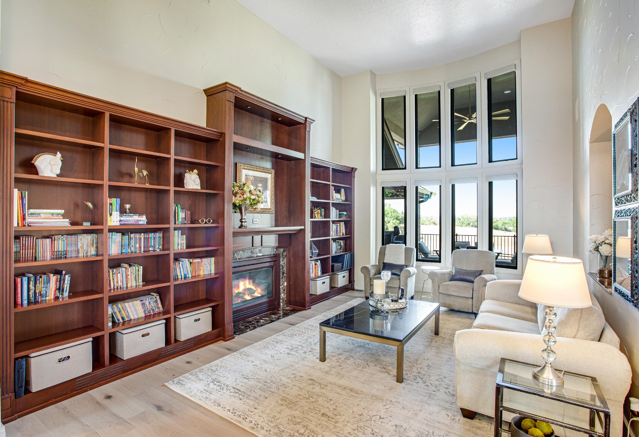 • Family room features 20’ ceilings, gas fireplace with marble backsplash, surround sound speakers, built-in shelving with crown molding, remote blinds and incredible views