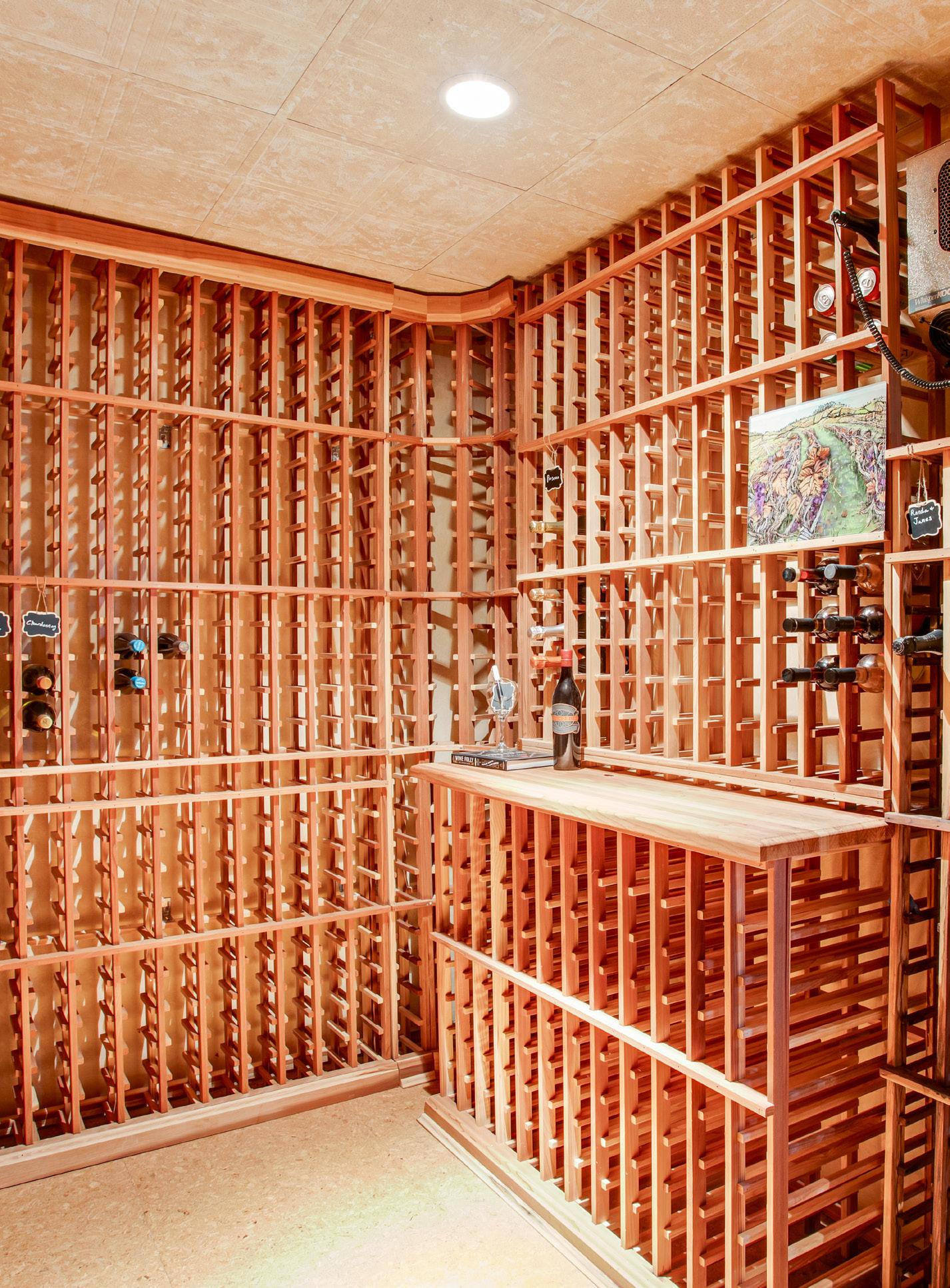 • Wine room with arched rock entrance, cork board flooring and 500+ bottle storage