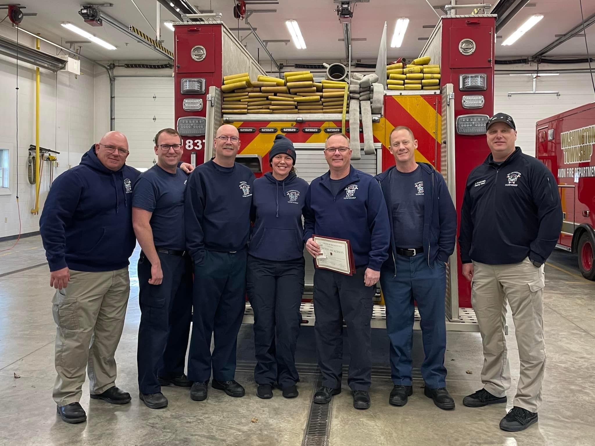 Congratulations to Doug Dickerson as he received his 30 years of service award and pin on Jan. 5. He is the first to reach the 30-year mark as a career employee for the Washington Township-Avon Fire Department. We appreciate his dedication, kind demeanor, and willingness to be an informal leader for our organization. After 30 years, he still continues to contribute to the Washington TownshipAvon Fire Department and the community without question and always with a smile. We appreciate Chauffeur Dickerson and his contributions to the organization.