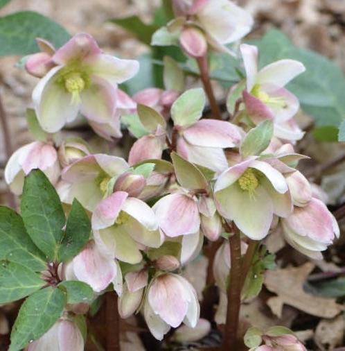 A few years ago, in addition to poinsettias, Christmas cactus, and amaryllis, white-blooming hellebores started showing up at garden centers in December. These beautiful plants are now commonly offered even in grocery stores. Unlike all the other flowering Christmas plants, hellebores are hardy perennials, and can be planted in your flower gardens or landscaping. The most commonly available, in fact the only one I’ve ever seen for sale at Christmas, is the beautiful variety ‘Ivory Prince’. All hellebore “blooms” last for months because the true blooms are the small yellowish center parts that are surrounded by large white bracts, back-blushed with pink. Just like poinsettias, after the true flower parts wither and fade, the bracts remain attractive literally for months. Although labeled “Christmas Rose”, ‘Ivory Prince’ is a variety of “Lenten Rose” (Helleborus Orientalis), which are more hardy and easier to grow than the true “Christmas Rose” (Helleborus Niger), which does bloom earlier, but is rarely available. ‘Ivory Prince’ is the result of a complex breeding program, with upward facing clusters of blooms and attractive, nearly evergreen leaves.