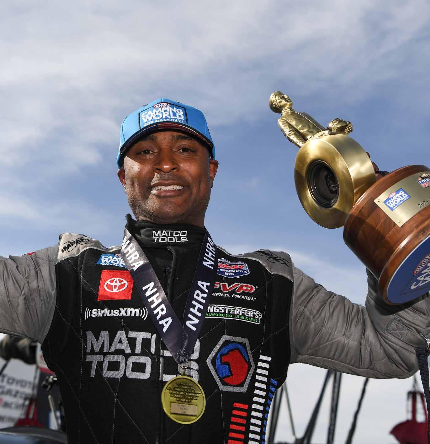 He is a three-time National Hot Rod Association (NHRA) Top Fuel World Champion and just won his 72nd career victory in April at the NHRA Four-Wide Nationals at The Strip at Las Vegas Motor Speedway.