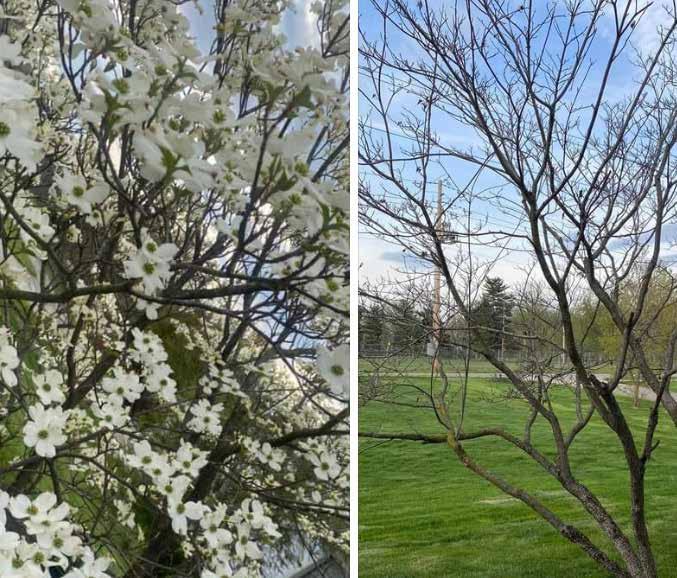 With the arrival of spring, the results of the cumulative damage to stressed plants became shockingly apparent. Trees are showing different degrees of damage or even death. (See the photo of a dogwood in 2022 compared to this spring.) Some trees that have survived have only partially leafed out and others have dead branches.