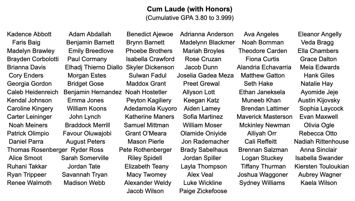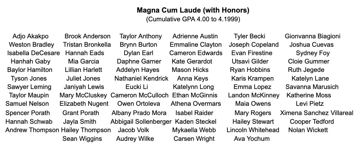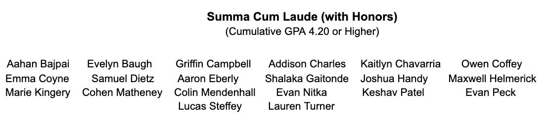 A: Indiana Academic All-Star, National Merit Scholarship Recipient, AP Scholar with Distinction, 2022 & 2023 Academic All-State for Cross Country, 2023 Mid-State Scholar Athlete for Cross Country, Graduated with Academic Honors and Summa Cum Laude, President’s Award for Academic Excellence, Wells Scholar Finalist, Rising Stars of Indiana Class of 2024, Outstanding Math Senior, Outstanding Economics Senior, Placed Top 10 in the State at HOSA in Eight Categories over the Past Three Years