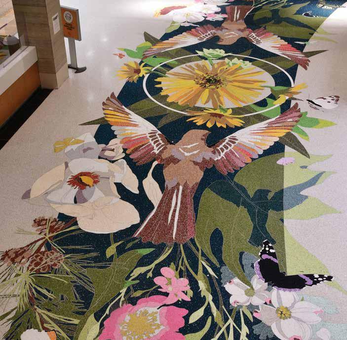 The inlaid design spans 20 x 90 feet between the ticketing area and the security checkpoint at the airport. Her focus in creating the design was to convey the magic of flight.