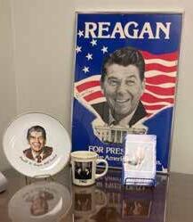 The desk shown here with Reagan items is where President Reagan sat, and the publicity sign was used to invite people to come to the parade to welcome him.