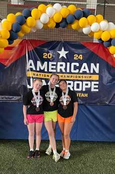 honor of traveling to Nationals in Salt Lake City, UT. This intense and fast-paced fiveday competition tested the girls’ metal and each one rose to the occasion. “Anna and Norah won in their division, but I have to say that all three did fantastic. They worked hard and made us proud,” said coach Matt. Both coach Jessica and coach Matt have a passion for the sport and are completely invested in the success of their athletes, and both look to encourage each athlete individually, while fostering a mentality of team spirit and unity. “What makes me the proudest is when I see the jumpers come together, support one another, and work together as a team. They encourage each other to rise to the next level. I want each jumper to succeed, to reach their goals,” said coach Jessica. “I am proud of each jumper, nervous for each of them when they perform, and excited (jumping up and down) for each of them when they succeed,” said Coach Matt.