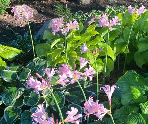 A few years ago, on a pleasant summer day, we were admiring an impressive planting of Sieboldiana ‘Elegans’ hostas whose huge blue leaves were punctuated by bright pink flower clusters of Lycoris squamigera, fondly known as “Resurrection Lilies” or by the popular nickname “Naked Ladies”. We overheard people wondering aloud what rare hosta variety had bright pink blooms.