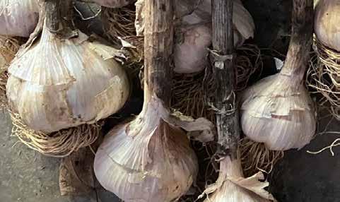 Planting garlic is easy. It grows just fine in typical garden soil as long as it has good drainage. Break apart the heads of garlic and plant individual cloves pointy side up about 2” deep and spaced 4” apart. It’s not advisable to fertilize when planting. Water well, and the cloves will soon sprout green shoots which usually get a few inches tall before winter weather sets in. Mulch with up to six inches of straw or shredded leaves. In spring, side-dress with a nitrogen rich fertilizer such as blood metal, composted chicken manure, or cottonseed meal, or any slow-release nitrogen source. Keep well-watered during dry spells. Watch for emerging flower scapes in late spring, which are delicious boiled, fried, or grilled. Popular advice is that garlic should be harvested when the first four leaves from the bottom have browned. After pulling your garlic, don’t cut off the stalk or roots. Shake off loose soil and place your plants on a wire rack or hang them, roots up to cure. After two weeks, remove the dry stalks and roots. Store your garlic in a dry, dark place. A paper bag (not plastic) works well.