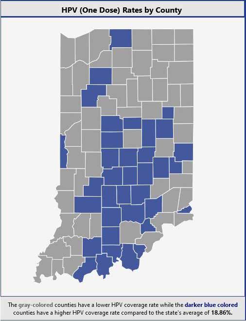 Currently, Indiana’s HPV vaccination rate is below the national average and ranks 36, according to America’s Health Rankings. The Indiana Department of Health shows HPV one-dose rates to be 25.38% in Marion County; 23.31% for Johnson County; 23.21% for Hendricks County; and 19.99% for Morgan County for children ages 9-12. The state’s average of one-dose rates is 18.86%.