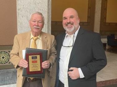From left, Senator Jack Sandlin receives a plaque from Aaron Dukette. (Submitted photo)