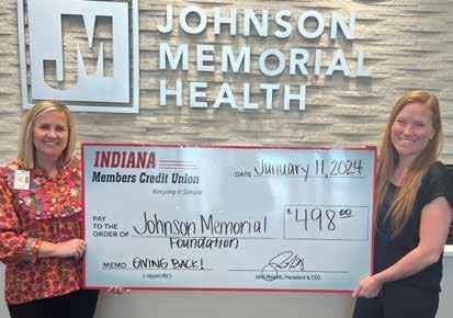 Indiana Members Credit Union (IMCU) recently presented a check for $498 to Johnson Memorial Hospital Foundation as part of an ongoing debit card giveback program. The partnership allows members to show their support of the independent nonprofit hospital by signing up for a Johnson Memorial Health debit card. Every time the card is used as a signature- based transaction, Johnson Memorial Hospital Foundation benefits. The more cards that are in use, the larger the contribution. Since beginning the program in 2018, Johnson Memorial Hospital Foundation has earned $1,381 through this IMCU giveback program. In 2023, IMCU contributed a total of $100,000 through its Giveback Debit Card Program.