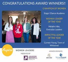 Aspire Economic Development + Chamber Alliance has announced the winners for its 2024 Women Leaders awards. Stage 1 Dance Academy received the Champion of Women Award; Malahni Ake with Everyday Leaders received the Woman Leader of the Year Award; and Carmen Young, director of Administration for the Town of Whiteland, received the Impactful Leader Award. Winners were announced March 8 at the Woman Leaders Workshop held at Valle Vista Golf and Conference Center.