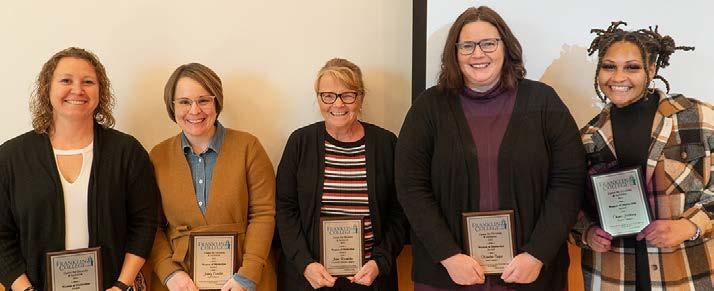 Award winners, from left to right: Tiffany (Henderson) Franklin, Ed.D., New Palestine, Ind.; Jenny (Piland) Cataldi, Indianapolis; Jane Roembke, Indianapolis; Kandra Sejas, Greenwood; and Chyna Jackson, Indianapolis. (Photo courtesy of Franklin College)