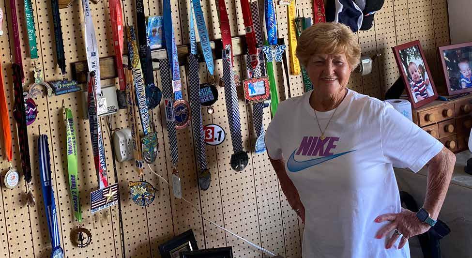 (Cover) Southsider Sue Stone shows off an evergrowing collection of medals she has earned since deciding five years ago at 78 to walk and "prance" in marathons. (Photo by Sherri Coner)