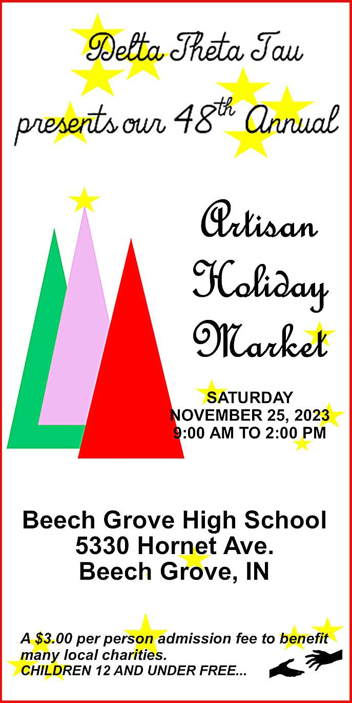 48th Artisan Holiday Market • Admission: $3. There will be 150 juried vendors at this year’s fair, from fine handcrafted home decor, candles, custom jewelry, fine clothing and accessories, children's items and toys, body and bath products, pet treats, and accessories. Arrive early to receive a swag bag for the first 200 visitors. This fair is 100% nonprofit, presented by the Delta Theta Tau, Nu Tau chapter, that helps support many local food pantries, animal rescues, senior citizen centers, and school pantries, from all proceeds. | When: Nov. 25, 9 a.m. - 2 p.m. | Where: Beech Grove High School, 5330 Hornet Ave., Beech Grove. | Info: facebook.com/handmadedtt