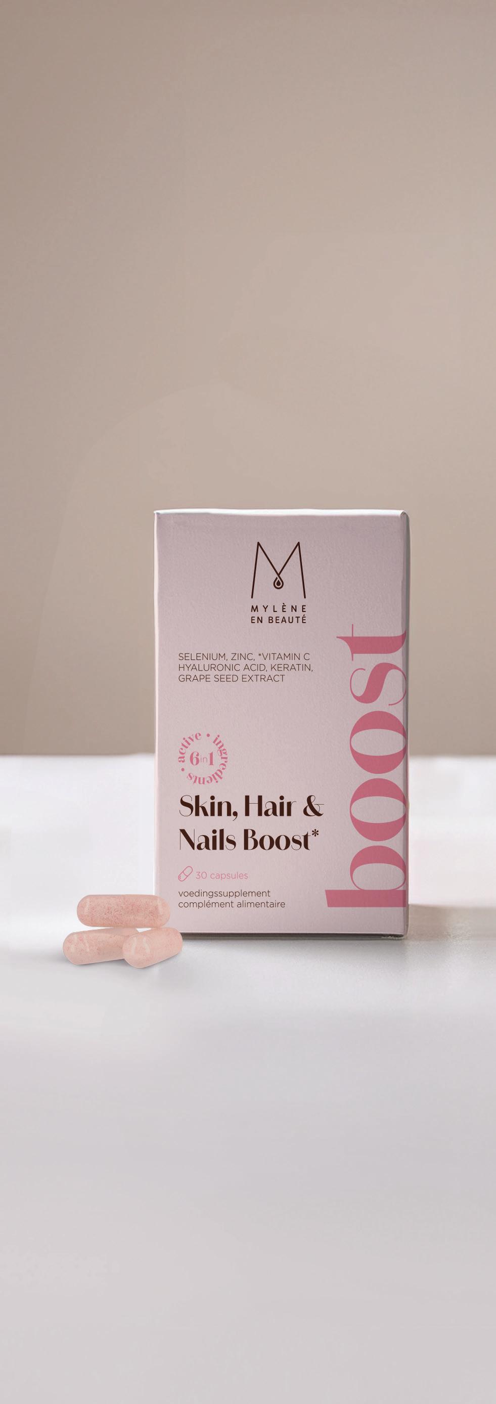 De supplementen van Mylène zijn speciaal ontwikkeld om jouw natuurlijke schoonheid van binnenuit te laten stralen. Ze dragen bij aan een stralende huid, gezond haar en sterke nagels.