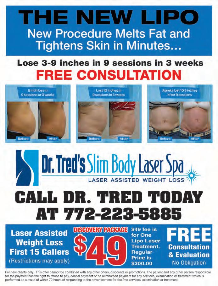 VOL. 563 A 37 Copyrighted© My Living Media. 2023 All Rights reserved. To Advertise call 772-247-6849 Need More Coupons - MyLivingMedia.com *For New Clients only. This offer cannot be combined with any other offers, discounts or promotions. The patient and any other person responsible for the payment has the right to refuse to pay, cancel payment or be reimbursed payment for any services, examination or treatment which is performed as a result of within 72 hours of responding to the advertisement for the free services, examination or treatment. THE NEW LIPO New Procedure Melts Fat & Tightens Skin in Minutes… Laser-Assisted Weight Loss First 15 Callers (Restrictions may apply) $49 fee is for One Lipo Laser Treatment Regular Price is $300 FREE Consultation & Evaluation No Obligation DISCOVER PACKAGE $49 CALL DR. TRED TODAY 772-223-5885 Lose 3-9 Inches in 9 sessions in 3 weeks FREE CONSULTATION 2311 SE Ocean Blvd., Suite A, Stuart, FL 34996 www.drtredsslimbodylaserspa.com 1998 SE St. Lucie Boulevard 772-247-3205 HAPPY HOUR MONDAY KIDS EAT FREE From 3pm to 6pm All bottles of wine up to $125. Every Sunday with adult purchase. Face painting from 12 PM to 2 PM All spirits 50% OFF $2OFF SCAN HERE FOR RATES GREAT FOOD WITH A SIDE OF GOLF • CLIMATE CONTROLLED BAYS • DELECTABLE FOOD • HAND-CRAFTED COCKTAIILS HITTING BAYS POWERED BY