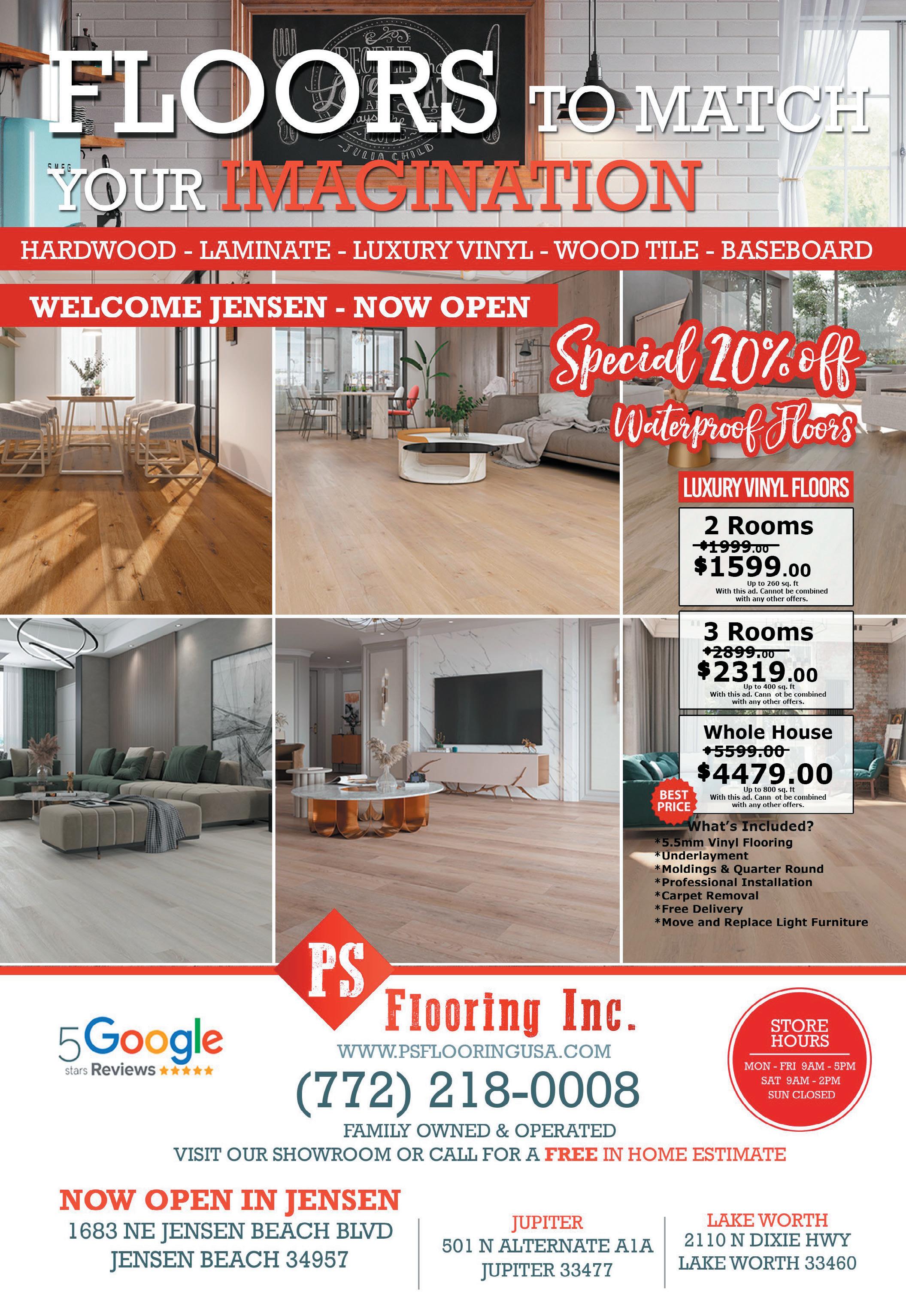 2 VOL. 558 A Copyrighted© My Living Media. 2023 All Rights reserved. To Advertise call 772-247-6849 *See store for details: Items Previously Discounted TAKE AN ADDITIONAL 25% OFF! HUGE MARKDOWNS - FIREPLACES - ARTWORK - LAMPS CEILING LIGHTS & FANS - SO MUCH TO CHOOSE FROM HUGE TENT SALE SAVINGS WEEKEND SALE EVENT SATURDAY, JANUARY 28TH & SUNDAY, JANUARY 29TH FREE FAUCET WITH ANY VANITY PURCHASE (1 FAUCET PER VANITY) IN-STOCK CORETEC LUXURY VINYL FLOORING BLOWOUT SALE! REMNANTS ANY SIZE ONLY $79 OMEGA & KITCHEN KRAFT CABINETS UP TO 30% OFF FREE AREA RUG ($250 VALUE) FREE SINK ($250 VALUE) WITH THE PURCHASE OF 1000 SQ. FT. OF FLOORING OR MORE! WITH THE PURCHASE OF KITCHEN * Subject to credit approval. | ** See warranty guide for complete details. See store for details. At participating stores only; not all products at all locations. Photos for illustrative purposes only. Not responsible for typographical errors. Offers cannot be combined with other discounts or promotional offers and are not valid on previous purchases. © 2012 Carpet One Floor & Home®. All Rights Reserved. Serving the Treasure Coast for over 38 years Stuart 1975 SE Fischer St (Next to Lowes) 772-232-8854 CABINETS • LIGHTING • PLUMBING FIXTURES • FLOORING FURNITURE • CEILING FANS • AREA RUGS • WINDOW TREATMENTS RameyFloorandHome.com