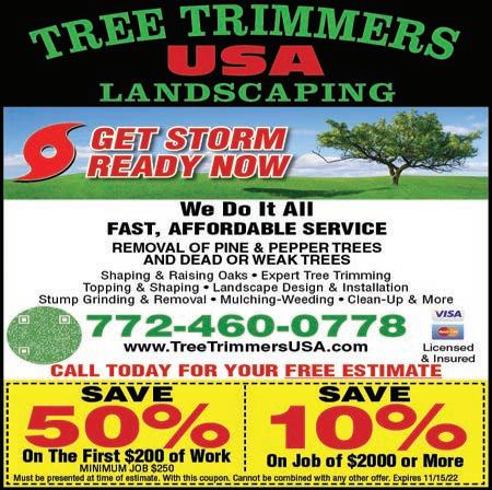 44 VOL. 552 B Copyrighted© My Living Media. 2022 All Rights reserved. To Advertise call 772-247-6849 METAL ROOFS just got MORE AFFORDABLE! • METAL ROOFING • TILE ROOFING • SHINGLE ROOFING Financing Available Satisfaction Guaranteed! Call Today (772) 291-1427 Lic. No. CCC1327906 FREE ESTIMATES $500 OFF Call Today! ANY ROOF REPLACEMENT Must present coupon at time of estimate for discount. Exp. 11/11/22 Make Your Shower & Floors Look New Again! THE GROUTSMITH • Tile & Grout Cleaning • Grout Restoration • Tile & Grout Repair • Loose & Hollow Tile Rebonding • Shower Repairs & Regrouting • Non-Slip Tile Treatment Call today for a FREE Estimate • 772-224-3011 or 1-800-561-3736 • www.GroutsmithStuart.com SEE THE DIFFERENCE WE CAN MAKE IN THE LOOK OF YOUR HOME! Your Grout & Tile Cleaning Experts $30OFF ANY JOB OF $300 OR MORE $50OFF ANY JOB OF $500 OR MORE With this MLM coupon only. Cannot be combined with any other offers or specials. Expires 11/11/22 No More Dirty Grout! Guaranteed for 10 Years! Before Before After After With this MLM coupon only. Cannot be combined with any other offers or specials. Expires 11/11/22 772-224-7347 FREE ESTIMATES 10% OFF With this MLM Coupon at time of estimate. Expires 11/11/22 NOW ACCEPTING ALL CREDIT CARDS Ramos TREE SERVICE ✔ Tree Removal ✔ Tree Trimming ✔ Tree Topping ✔ Hedge Trimming and More! YOUR LOCAL TREE TRIMMING EXPERTS! INSUREDLICENSED Best Rates In Town! QUALITY SERVICE YOU CAN TRUST GET THOSE TREES CUT FOR HURRICANE SEASON!