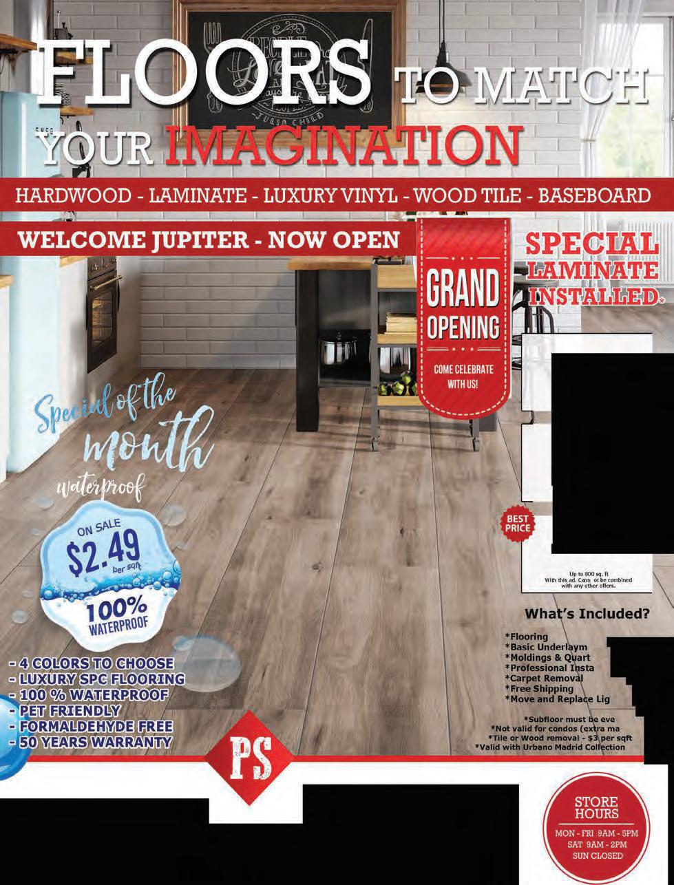 Flouring Inc. WWW.PSFLOORINGUSA.COM (561) 612-4039 5Google stars Reviews ••••• FAMILY OWNED & OPER ATED 2 Rooms •999.oo Up to 260 sq. ft With thisad.Cannotbecombined with any other offers. 3 Rooms •1499.oo Up to 400 sq. ft With thisad.Cann otbecombined with any other offers. Whole House •2799.oo ent er Round llatlon ht Furniture n y apply) extra 8mm0nly VISIT OUR SHOWROOM OR CALL FOR A FREE IN HOME ESTIMATE NOW OPEN IN JUPITER 501 N ALTERNATE AlA JUPITER 33477 LAKEWORI'H 2110 N DIXIE HWY LAKEWORTH 33460 ROYAL