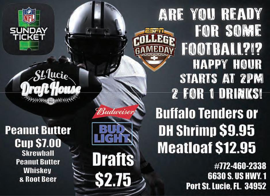 22 VOL. 551 B Copyrighted© My Living Media. 2022 All Rights reserved. To Advertise call 772-247-6849 Need More Coupons - MyLivingMedia.com RISTORANTE & PIZZERIA 772.335.2988 | www.Ruffinos.net 1145 S.E. Port St. Lucie Blvd., Rivergate Plaza, Port St. Lucie TUESDAY PIZZA SPECIAL $999 16” MEDIUM TAKE-OUT ONLY! Now Open for Dinner 4:00 - 9:00PM Closed Monday Dine In,Take Out,or Delivery RUFFINO’S We Are Back from Vacation! RE-OPEN SEPT. 1ST @ 4PM 772-334-2184 Monday-Saturday 10am-5pm; Closed Sundays $5off Your choice of Dip 14 Different Flavors to choose from! (Jensen Beach Location Only) With MLM coupon. Expires 10/31/22 1500 NE Dixie Hwy, Jensen Beach “WeSmokeEverythingbut theMermaids!” Sunday- Thursday 10AM-12AM Friday & Saturday 10AM-2AM 2061 S US 1, Fort Pierce 772-773-6460 MATCH PLAY $20 FOR $20 Must Present This MLM Coupon Some Restrictions Apply. Limit One. Expires 10/31/22 Hit $100 on Fish Table Get 1 Ticket Hit $50 Get 1 Ticket FRIDAY • SATURDAY • SUNDAY 7 Come in to Play Mon - Thur & Get 1 Free Entry Per Day! Entries Valid for All Three Drawings
