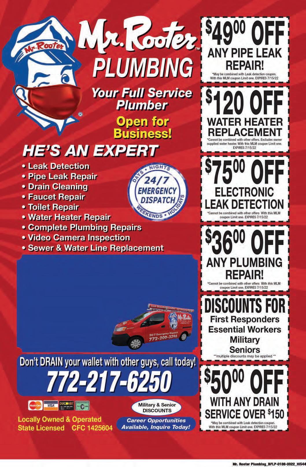28 VOL. 551 B Copyrighted© My Living Media. 2022 All Rights reserved. To Advertise call 772-247-6849BenFranklinPlumber.com Lic.#CFC1430437 Ins. EOE/DFWP ★ ★ ★ ★ ★ ★ ★ ★ ★ ★ ★ ★ ★ ★ ★ ★ ★ ★ ★ ★ ★ 772-380-4451Call Today 24/7 EMERGENCY SERVICE • Clogged Drains • Water Heaters • Toilet Repairs • Garbage Disposals • Leak Detection • Whole House Re-Pipe $47 Service call Will call with 45 minute notice when on the way. Client must be available between 8am-6pm the day the appointment is booked. Coupon can be used M-F excludes holidays. Cannot be combined with any other offer. EXPIRES 10/28/22 EXPIRES 10/28/22 EXPIRES 10/28/22 EXPIRES 10/28/22 EXPIRES 10/28/22 EXPIRES 10/28/22 HARD WATER SPEEDS UP AGING OF YOUR HOME’S PIPES. IT ALSO CLOGS PIPES AND WON’T MAKE YOU LOOK ANY YOUNGER. WE CAN HELP! PLUMBING $75 off Any New Toilet Provided & Installed by BFP Cannot be combined with any other offers. Cannot be combined with any other offers. Cannot be combined with any other offers. Cannot be combined with any other offers. Cannot be combined with any other offers. Any Standard, Deluxe, or Premium Water Heater $100 off Any Whole House City Water Filtration System $300 off Any Whole House Tankless Water Heater $150 off$50 off ANY PLUMBING REPAIR Over $225 If there’s any delay, it’s you we pay!®