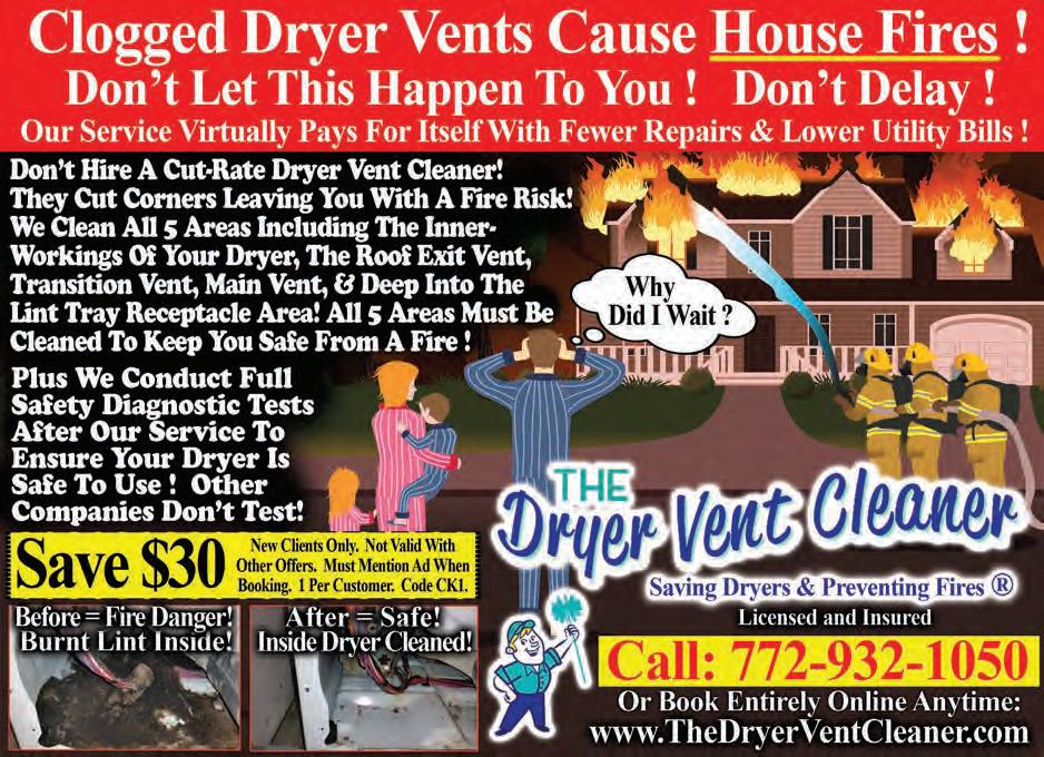 VOL. 551 B 39Copyrighted© My Living Media. 2022 All Rights reserved. To Advertise call 772-247-6849 Need More Coupons - MyLivingMedia.com FORT PIERCE OFFICIAL DEALER FOR 1850 S US Hwy 1, Fort Pierce, FL 34950 |(772) 222-5233 TRUCK PARTS & SERVICE SPECIALS EVERY MONTH $ DOT INSPECTION LESS THAN ONLY FOR VEHICLES 10 YEARS OLD TRUCK PARTS & SERVICE SPECIALS EVERY MONTH 1850 S US Hwy 1, Fort Pierce, FL 34950 | (772) 222-5233 FORT PIERCE OFFICIAL DEALER FOR 1850 S US Hwy 1, Fort Pierce, FL 34950 |(772) 222-5233 ISUZU PARTS TRUCK PARTS & SERVICE SPECIALS EVERY MONTH FORT PIERCE OFFICIAL DEALER FOR 1850 S US Hwy 1, Fort Pierce, FL 34950 |(772) 222-5233 PUREGENUINE PARTSHINO ISUZU PARTS TRUCK PARTS & SERVICE SPECIALS EVERY MONTH FORT PIERCE OFFICIAL DEALER FOR 1850 S US Hwy 1, Fort Pierce, FL 34950 |(772) 222-5233 ISUZU PARTS TRUCK PARTS & SERVICE SPECIALS EVERY MONTH FORT PIERCE OFFICIAL DEALER FOR 1850 S US Hwy 1, Fort Pierce, FL 34950 |(772) 222-5233 PUREGENUINE PARTSHINO ISUZU PARTS TRUCK PARTS & SERVICE SPECIALS EVERY MONTH FORT PIERCE OFFICIAL DEALER FOR 1850 S US Hwy 1, Fort Pierce, FL 34950 |(772) 222-5233 ISUZU PARTS TRUCK PARTS & SERVICE SPECIALS EVERY MONTH FORT PIERCE OFFICIAL DEALER FOR 1850 S US Hwy 1, Fort Pierce, FL 34950 |(772) 222-5233 PUREGENUINE PARTSHINO ISUZU PARTS TRUCK PARTS & SERVICE SPECIALS EVERY MONTH 222-5233 PARTS EVERY MONTH OFFICIAL DEALER FOR $100 OFF Family Owned & Operated Since 1980 GUTTER INSTALLATION 1379 SW Biltmore St., Port St. Lucie 34983 772.241-4181 PNSGutters.com psseamlessgutters@outlook.com Minimum 250 ft. With this MLM coupon. Expires 10/28/22 Licensed & Insured #CBC1261971 P & S Seamless Gutters Does Your Dryer Vent Need Cleaning? 1-Year Full Service Guarantee! $30 off Any Dryer Vent Cleaning Service MLM Coupon Expires 10/31/22 CALL FOR DETAILS Neighbors Discount Special! Call Now! 772.362.1024 ✓Dryer Vent Cleaning ✓Speeds Up Drying Time ✓Residential ✓Commercial ✓Licensed & Insured WHAT WE CLEAN: • The Roof Exit Pipe • Transition Vent • The Inner Workings of Your Dryer • Lint Tray Receptacle • Main Vent