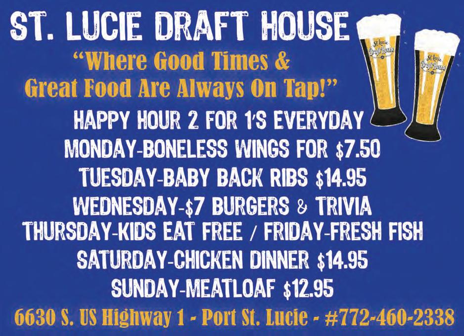 26 VOL. 561 B Copyrighted© My Living Media. 2023 All Rights reserved. To Advertise call 772-247-6849 Need More Coupons - MyLivingMedia.com Minimum Purchase of $25 Not to be combined with other discounts. Dine in only. One coupon per table. Exp. Every Day 4-6pm $795 Appetizers $5 Wine $6 Martinis $5 Well Drinks $4 Beers 1411 SE Indian Street (First traf c light West of US#1) • www.FreshCatchStuart.com • 772-286-6711 OFF LUNCH OFF TAKE OUT Minimum Purchase of $25Minimum Purchase of $20 $5 $2 With this MLM coupon. Not to be combined with other discounts. Dine In Only. One coupon per table. Expires 3/17/23 With this MLM coupon. Not to be combined with other discounts. One coupon per table. Expires 3/17/23 B B OPEN FOR DINE-IN • TAKEOUT • CURBSIDE • DELIVERY OUTDOOR PATIO & SAFELY-DISTANCED TABLES AUTHENTIC THAI & JAPANESE CUISINE VOTED ONE OF STUART’S TOP RESTAURANTS 772-692-8780 LUNCH SPECIALS Serving Tuesdays - Friday 11:30 - 2:30 DINE IN OR TAKE OUT JAPANESE BENTO BOX COMBO FLAVORFUL THAI DISHES OR *Equal or Lesser Value 1520 NW Federal Hwy. Stuart, FL 34994 HOT SAKE BUY 1 GET 1 www.sushiyamasiam.com SushiYamaSiam 1/2 OFF With this MLM coupon. Offer expires 3/15/23With this MLM coupon. Offer expires 3/15/23 LUNCH Tuesday - Friday: 11:30am-2:30pm Saturday: Noon-2:30PM CLOSED SUNDAY & MONDAY DINNER Tuesday - Thursday: 4:30pm-9pm Friday & Saturday: 4:30pm-9:45pm JOIN OUR REWARDS PROGRAM Like & Follow Us on Facebook For 10% OFF Your Next Order Happy Hour Early Bird Special: 4:30pm-6:30pm THE ROAD TO RECOVERY… MONDAY-FRIDAY 3PM-7PM $1 OFF ALL PINTS $5 WELL DRINKS $5 HOUSE WINE 772-345-8490 10350 SW DON R. LED DUKE DRIVE, PORT ST. LUCIE SUNDAY-THURSDAY 11:30AM-10PM • FRIDAY & SATURDAY 11:30AM-11PM RecoverySportsGrill.com $5 OFF ANY PURCHASE of $25 or More Dog Friendly Outdoor Seating STARTS HERE! (LOCATED IN TRADITION) MONDAY 50¢ WINGS TUESDAY Trivia 7pm-9pm WEDNESDAY Live Music 6pm-9pm THURSDAY Burger Special EARLY BIRD Mon-Fri 4pm-5:30pm Now Open For Lunch 7 Days A Week COME CHECK OUT OUR NEW SPECIALS! With this MLM Coupon Expires 3/17/23 AFTER 4PM