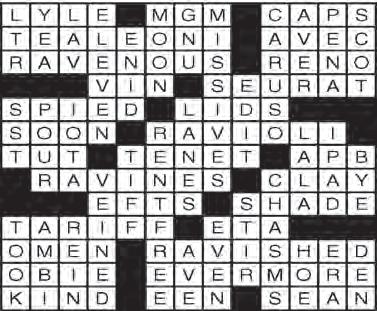62 VOL. 563 D Copyrighted© My Living Media. 2023 All Rights reserved. To Advertise call 772-247-6849 Need More Coupons - MyLivingMedia.comPUZZLE PAGE SUDOKU PUZZLE PUZZLE PAGE CROSSWORD ACROSS 1 Singer Lovett 5 “Ben-Hur” studio 8 Beanies 12 “Madam Secretary” actress 14 Opposite of “sans” 15 Very hungry 16 Gambling city 17 Coq au -18 Painter Georges 20 Watched surreptitiously 23 Pot covers 24 Any time now 25 Stuffed Italian pasta 28 Boy king 29 Doctrine 30 NYPD alert 32 Gulches 34 Potter’s medium 35 New newts 36 Tint 37 Import duty 40 JFK info 41 Portent 42 Enraptured 47 Theater award 48 Eternally 49 Variety 50 Still, in verse 51 Playwright O’Casey DOWN 1 USPS delivery 2 Pro vote 3 Restroom, for short 4 Football team 5 Earth circler 6 Bearded beast 7 Written messages 8 Tenor Enrico 9 Say it’s so 10 Elizabeth of “Jacob’s Ladder” 11 Highlander 13 Oklahoma city 19 Redact 20 Retired jet 21 Serve coffee 22 Greek vowel 23 Highway divisions 25 Cheap way to live 26 Chorus syllables 27 Apple tablet 29 Squabble 31 “See ya!” 33 Like marble 34 Great divides 36 Commotion 37 Grabbed 38 Both (Pref.) 39 Check 40 Divisible by two 43 St. crosser 44 Weed whacker 45 Notable time 46 Lair Solutions See Page 70