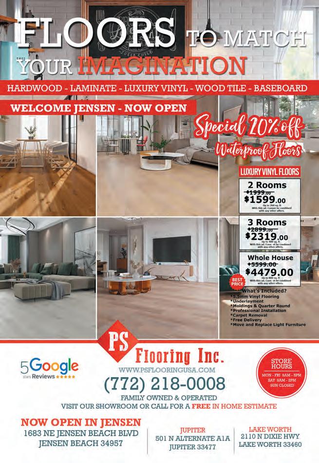 46 VOL. 564 D Copyrighted© My Living Media. 2023 All Rights reserved. To Advertise call 772-247-6849 Need More Coupons - MyLivingMedia.com WWW.TKGUTTERS.COM 772-692-9727 | 561-250-2184 Authorized Dealer For PRESERVE & PROTECT YOUR HOME, FOUNDATION, & LANDSCAPING FROM WATER DAMAGE • Seamless • Modern Box • Half Round • Commercial • Aluminum • Copper Steel • Installation • Cleaning • Manufacturing • Repair • Maintenance • 5-YEAR WARRANTY FREE ESTIMATES Licensed & Insured License #MCNS4803 3215 SE GRAN PARK WAY STUART, FL 34997 WHAT'S IN YOUR GARAGE? ® BUY, SELL, OR TRADE 561-202-3580 772-672-3080 BUY, SELL, OR TRADE ® SALES | STORAGE | CONSIGNMENT THE BEST CHOICE NOW OPEN IN JUPITER! COME VISIT OUR NEW SHOWROOM 561-277-9943 OFFERING A WIDE VARIETY OF LUXURY HARDWOOD • LAMINATE • VINYL • BASEBOARDS AND MORE! MON-FRI: 9AM-6PM SAT: 9AM-2PM SUN: CLOSED CONTRACTORS WELCOME! 2562 WEST INDIANTOWN RD, SUITE B-3 • JUPITER LOCATED NEXT TO DOMINOS IN THE GREEN TURTLE PLAZA FAMILY OWNED & OPERATED FREE IN HOME ESTIMATE FINANCING AVAILABLE FIND US ON 5 STAR REVIEW SPECIALGRANDOPENING 20%SAVINGS OffAPPLIESTOFLOORINGONLY Expires 5/15/2023 WE CARRY LUXURY HARDWOOD, LAMINATE AND VINYL FLOORING FROM THE USA AND EUROPE.