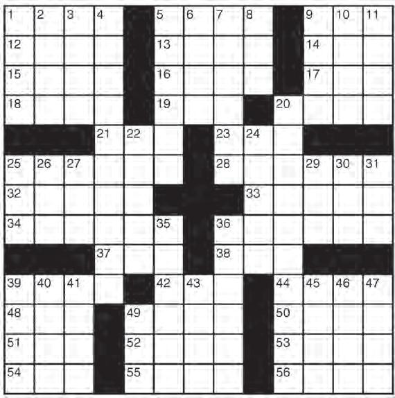 PUZZLE PAGE CROSSWORD ACROSS 1 Asian desert 5 Weep loudly 9 Swiss peak 12 Mideast gulf 13 “Night” author Wiesel 14 Life story 15 Pantheon members 16 Quest 17 Director Howard 18 Region 19 Texter’s “Wow!” 20 Full house, e.g. 21 Dolphins’ org. 23 Here (Fr.) 25 Used a hoe 28 Put a price on 32 Dole out 33 Stage 34 Show bad posture 36 Creatures 37 Your 38 Ornate vase 39 Corn castoffs 42 Tavern 44 Party pooper 48 Small battery 49 Ireland 50 Theater box 51 Norm (Abbr.) 52 Swampy terrain 53 Portent 54 That lady 55 River to the Baltic 56 Get one’s feet wet? DOWN 1 Quite enthusiastic 2 Bloodhound’s clue 3 Eliot’s “Adam --” 4 Important details 5 Observe 6 Grad 7 Improvise 8 Allow 9 Start of a spell 10 King of the jungle 11 Frogs’ hangout 20 Everywhere 22 Command to Fido 24 Prank 25 “Now, where -- I?” 26 Right angle 27 “Xanadu” band 29 Cooking fuel 30 Ballpark g. 31 -- Moines 35 Cross 36 Stovetop feature 39 Mama -- Elliot 40 Swearword 41 Commanded 43 Suf x for billion 45 “Arrivederci --” 46 On in years 47 Actor Hackman 49 Punk-rock subgenre Solutions See Page 100