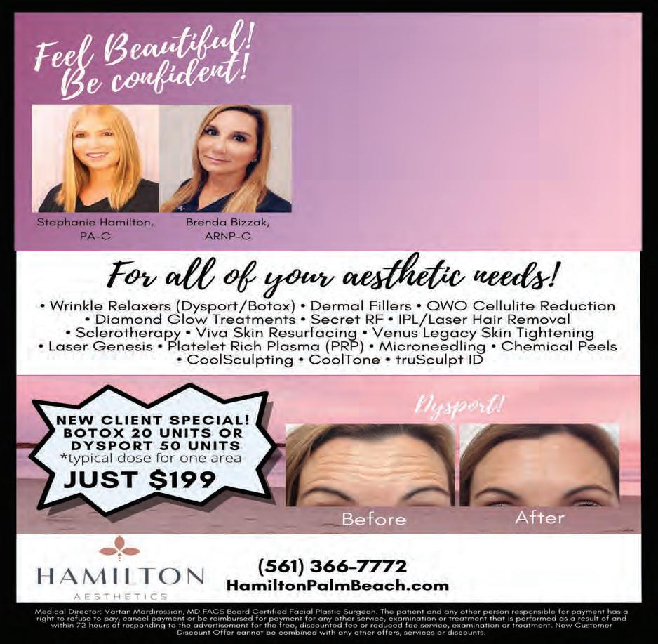 VOL. 551 I 59Copyrighted© My Living Media. 2022 All Rights reserved. To Advertise call 772-247-6849 Need More Coupons - MyLivingMedia.com 3399 PGA BLVD, Suite 450, Palm Beach Gardens, FL 33410 Before After Now at Hamilton Aesthetics! This cutting edge technology delivers up to 30% Permanent Fat Reduction, Sculpts 25% More Muscle, and Tightens Skin in one 30 min session! CALL NOW for your FREE CONSULT! INTRODUCING EMSCULPT NEO • Wrinkle Relaxers (Dysport/Botox • Dermal Fillers • QWO Cellulite Reduction • Diamond Glow Treatments • Secret RF • IPL/Laser Hair Removal • Sclerotherapy • Viva Skin Resurfacing • Venus Legacy Skin Tightening • Laser Genesis • Platelet Rich Plasma (PRP) • Microneedling • Chemical Peels • CoolSculpting • CoolTone • truSculpt ID • EmSculpt Neo VETERAN & SENIOR DISCOUNTS All Your Handyman Needs 772-281-9730 Veteran Owned • Licensed • Insured Call or Text Finish Trim Work Interior Carpentry Crown Molding Younique Custom Theater Trim & Design LLC facebook.com/theatertrim/ MARIJUANA CARDS Rooted Zen Healthcare Joel Nagler, M.D. 772.353.5222 www.RootedZenHealthCare.com 698 SW Port St Lucie Blvd. Unit 106 210-DAY RECOMMENDATIONS! New Cards Veterans Recerti cations $100 $100 BEST PRICING on the Treasure Coast $150