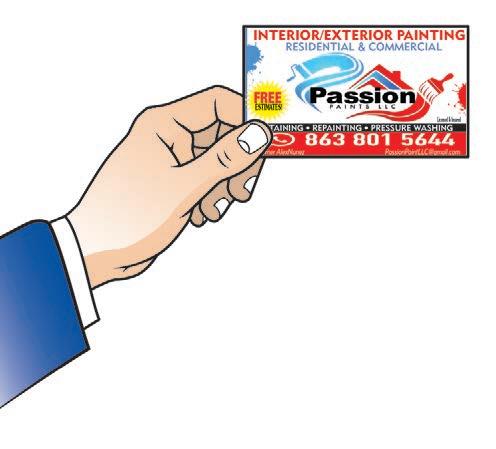 22 VOL. 559 J Copyrighted© My Living Magazines. 2023 All Rights reserved. To Advertise call 863-623-3219 Need More Coupons - OkeechobeeLiving.com Call today and receive a FREE SHOWER PACKAGE PLUS $1600 OFF With purchase of a new Safe Step Walk-In Tub. Not applicable with any previous walk-in tub purchase. Offer available while supplies last. No cash value. Must present offer at time of purchase. CSLB 1082165 NSCB 0082999 0083445 1-855-417-1306 SPECIALOFFER PROFESSIONAL BUSINESSDirectory Okeechobee Cell Phone Repairs 863-414-4202 All brands of cell phone & tablet repairs. New & Refurbished Cell Phone & Tablet Sales. Financing Available with No Credit Check. Insurance Available for all devices. 2939 SW 3rd Terrace Hours of Operation: 10:00am - 7:00pm Mon-Sat WE MAKE HOUSE CALLS! STAINING • REPAINTING • PRESSURE WASHING RESIDENTIAL & COMMERCIAL INTERIOR/EXTERIOR PAINTING FREE ESTIMATES! Owner AlexNunez PassionPaintLLC@gmail.com Licensed & Insured Regular Carport Starting at...$2220 We Are a Carolina Carport Dealer! Lakeside Aluminum Sales, LLC Lakeside Aluminum Sales • 2207 US HWY 441 SE • Okeechobee • 863-763-6699 INSTALLED CARPORTS GARAGES ALL FULLY CUSTOMIZABLE! 18x20x10 DOES YOUR MOBILE HOME NEED A NEW WOOF?! CALL THE EXPERTS @ 800-226-1334 www.AMSOFFLA.com Your Mobile Home and RV Roof Experts Since 1977 - Lic & Ins CCC1332419 - CGC1528678 772-882-0644 T&M HANDYMAN SOLUTIONS LLC NEED A HANDYMAN? NO JOB TOO SMALL FLOORING • PAINTING • INTERIOR REMODEL • CABINETRY Registered & Insured • HANNAFORD67@GMAIL.COM Veteran Owner/Operator Tom Hannaford FREE ESTIMATES ON ALL SERVICES Medicare may not cover 100% of your medical costs. The missing piece is up to you. CA25633ST • 4006 Nw 50Th Dr Okeechobee, FL 34972 Charity Walker • 863-801-1134 Call today for more information. Charity Walker • 863-801-1134 Licensed insurance agent/producer contracted with UnitedHealthcare Insurance Company Medicare may not cover 100% of your medical costs. The missing piece is up to you. CA25633ST • 4006 Nw 50Th Dr Okeechobee, FL 34972 Charity Walker • 863-801-1134 Call today for more information. Charity Walker • 863-801-1134 Licensed insurance agent/producer contracted with UnitedHealthcare Insurance Company Join Our Professional BUSINESS DIRECTORY CALL TO PLACE YOUR BUSINESS HERE! 863-623-3219 Okeechobee Living