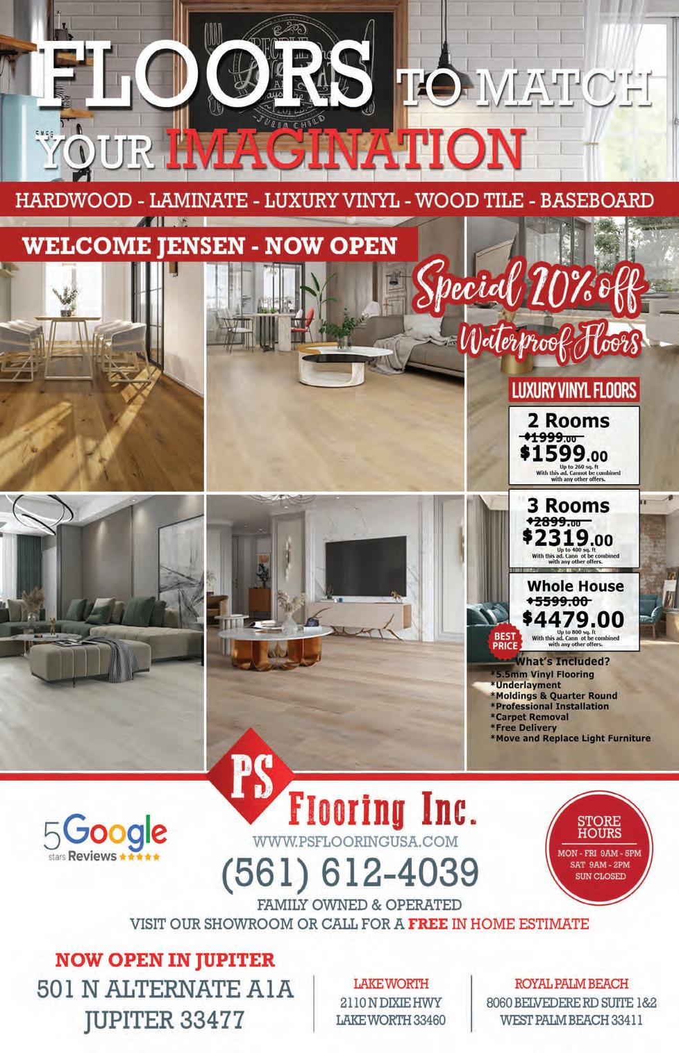 VOL. 562 N 3 Copyrighted© My Living Media. 2023 All Rights reserved. To Advertise call 772-247-6849 Need More Coupons - MyLivingMedia.com Make a GREAT First Impression with new Front Doors! New Solid Core Doors • New Door Hardware • New Hinges We are Palm Beach County’s Largest Specialty Door Store WE HAVE DOORS TO FIT ANY BUDGET! Transform your home by installing new custom interior doors without the mess and hassle of major construction. Choose from a wide variety of contemporary, traditional and transitional door styles. License # CBC037800 FINANCING AVAILABLE Impact Resistant Fiberglass & Mahogany Entry Doors • Impact Resistant Decorative Glass Inserts Interior Doors • Impact Resistant French & Siding Glass Doors • Hurricane Impact Windows Call Today 561.678.5630 to schedule your FREE SHOWROOM appointment or schedule online www.FLORIDADOORS.COM BOCA RATON | 9858 Clint Moore Rd., Suite C-128 • Boca Raton, FL 33496 Tuesday - Friday • 9am - 5pm Saturday • 9am - 4pm WEST PALM BEACH | 346 Pike Road, Suite 6, West Palm Beach, FL 33411 Monday - Friday • 7am - 4:30pm Saturday • 9am - 4pm JUPITER | 75 E. Indiantown Road, Suite 507, FL 33477 Tuesday - Friday • 9am - 5pm Saturday • 9am - 4pm 15% OFF Installed Doors * Offer not valid on prior sale. Applies to installed exterior & interior doors only. Offer ends 4/ 30/2023