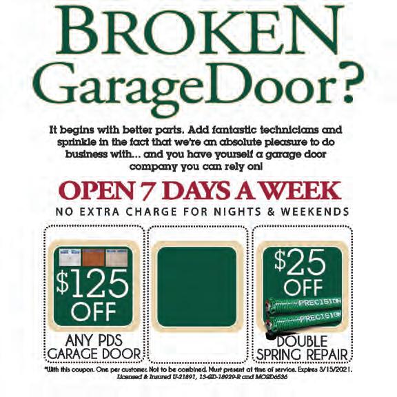 VOL. 562 V 47 Copyrighted© My Living Media. 2023 All Rights reserved. To Advertise call 772-247-6849 Need More Coupons - MyLivingMedia.com Veteran Owned 13+ years Experience Fully Insured PRESSURE WASHING ROOF CLEAN & SEAL! $50 OFF Coupons cannot be combined. 1 o er per visit. Exp 3/31/23 Roof Cleaning $250 OFF Coupons cannot be combined. 1 o er per visit. Exp 3/31/23 Roof Seal UP TO 772-398-1328 Licensed: PSL 07-6679 Insured: Workman’s Comp & Liability Landscaping • Custom Landscape and Design • Renovations and Cleanup • Tree Transplanting and Trimming • Mulch and Rock Installation • Plant and Shrub Installation • Bobcat Service & Grading WE SPECIALIZE IN DRAINAGE Irrigation/Sprinklers • Pumps • Wells Complete Fully Automatic Sprinkler System Call for a Entire System Sprinkler Check FREE ESTIMATE $85 • Check Valves • Adjust Heads • Timer Clocks • Rain Sensor With this MLM coupon. Expires 3/31/23 Up to 6 Zones Special J Guerne Landscape_0310-0823_LG562 Landscape & Sprinkler Live 24/7 Answering PDSMartin.com Locally Owned & Operated 772-732-2136 Expires 3/18/23. Our proprietary springs will not rust or corrode and last up to 4 times longer! FREE OPENER For NEW Garage Door Regular $65000 CANNOT BE COMBINED WITH OTHER OFFERS. MUST PRESENT AT TIME OF SALE. DOES NOT APPLY TO PREVIOUS SALES. EXP 3/18/23