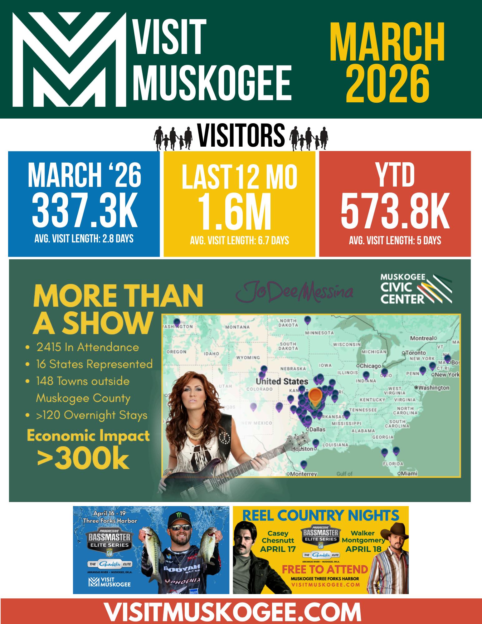 ThatprogresswasonfulldisplaywiththerecentJoDeeMessinaconcertattheMuskogeeCivic Center.Thiswasoneofthehighest-profileeventswehavehosted,anditdeliveredineveryway. Over 2,400 people attended the concert. Visitors came from 16 different states and 148 cities outsideofMuskogeeCounty.Theeventgeneratedmorethan120overnightstaysandproducedan estimated$300,000ineconomicimpact.