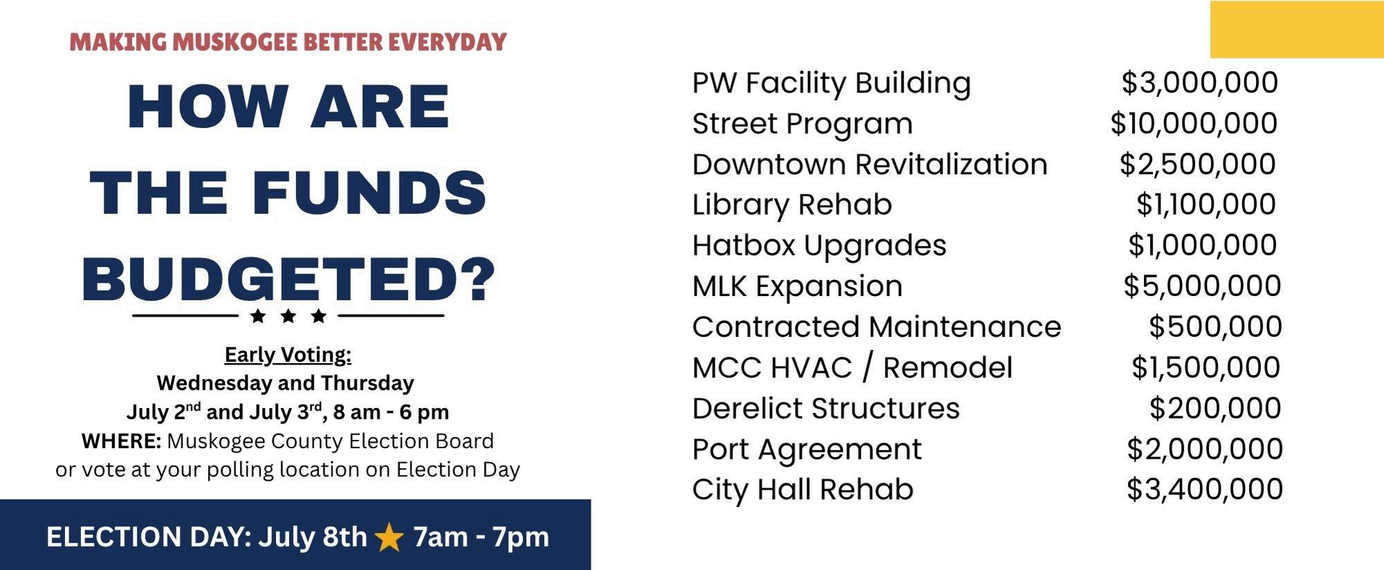 OnJuly8,2025,MuskogeevotersapprovedrenewingtheCIP (CapitalImprovementPlan)salestaxtofundimportant communityprojectsoverthenexteight(8)years.