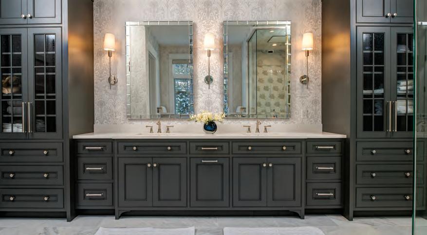 The primary bedroom echoes the entire home’s sophisticated casual blend of color, pattern and texture creating an inviting and understatedly elegant interior. The primary bath includes a double-bowl vanity, and each vanity side has personalized drawers as well as a decorative linen and towel storage cabinet. “We selected a bold graphite paint to add dimension and depth to the space,” says Brecheisen. “The cabinet styling is very classic and complements key elements in the home.”