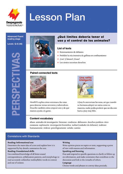 PAIRED TEXTS IN SPANISH, Levels A–V (1–50)* Despegando hacia la lectura ® Paired Spanish Texts Collections for K–2 and 3–5, including Perspectivas for Levels N–V, now offer an unparalleled resource of leveled, paired-text selections in Spanish!