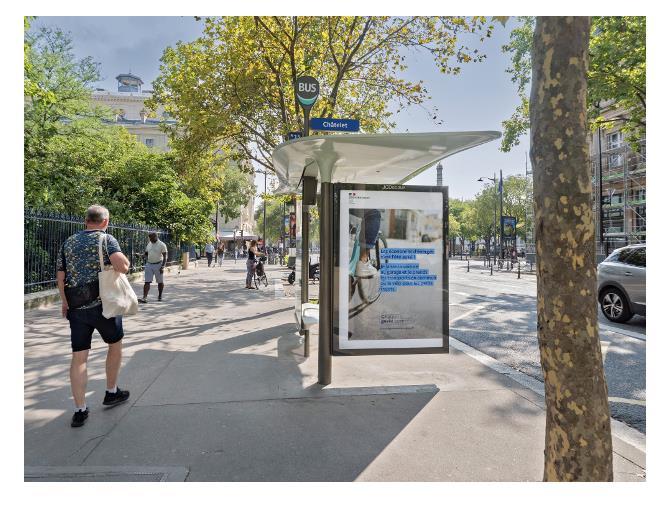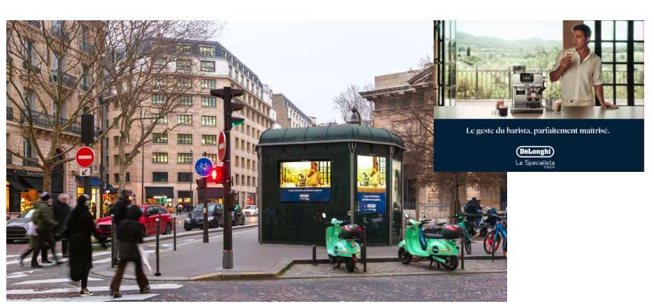 • La méthode : si certaines campagnes avec un visuel en mouvement constant, réalisez 2 photos soit une de l’écran et une de l’environnement avec les passants puis assemblez-les en post-production.