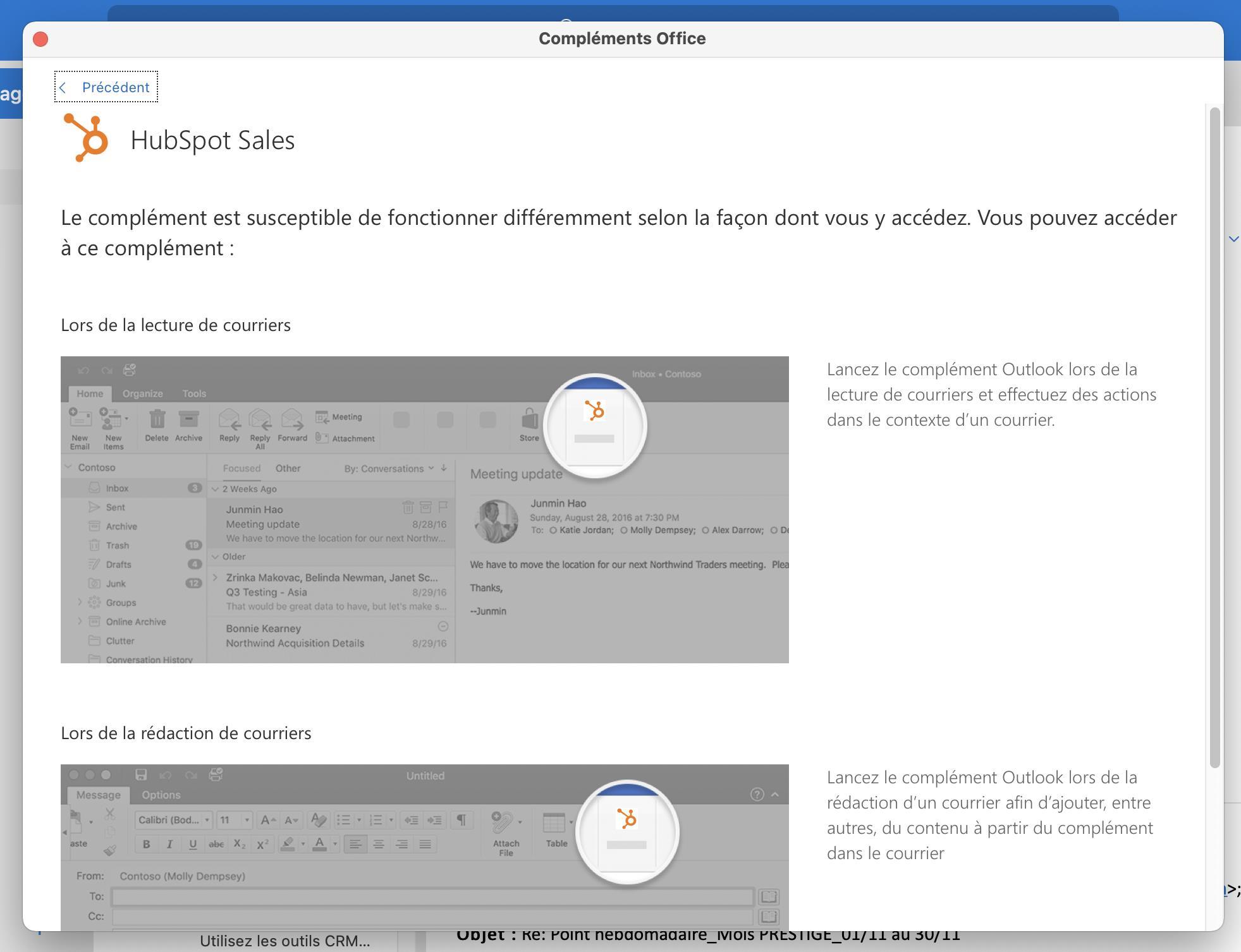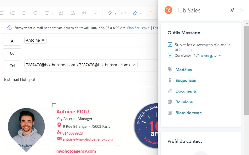 Normalement à la création d’un mail la fenêtre Hubspot reste ouverte. Soit le contact existe et vous aurez sa fiche