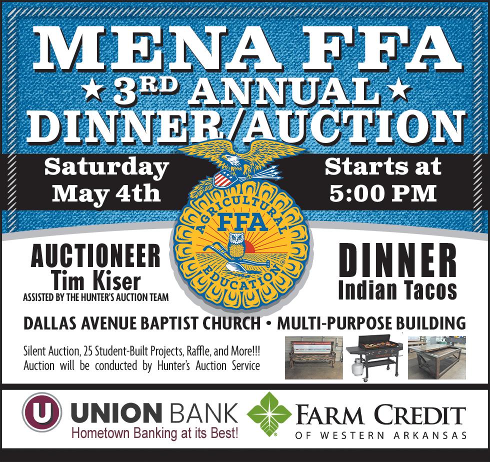 They will compete at the 97th annual National FFA Convention in Indianapolis, Indiana in October 22-26. Don’t forget that Mena FFA will be having their big dinner/auction Saturday evening. Last year’s crowd packed the parking lot of Dallas Avenue Baptist Church. See the ad below for details.