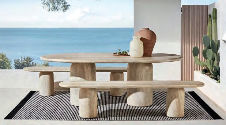 We love the Sacha outdoor dining table and bench. It features concrete framing and a travertine-look finish. It’s from Domayne, Maroochydore Homemaker Centre we love!