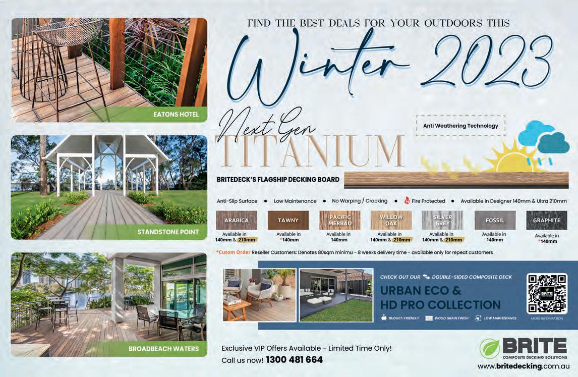 4 My Renovation | August 2023 PHONE TODAY 5493 7872 1/28 Ron Parkinson Cres. Bells Creek QLD 4551 www.metroll.com.au | sunshinecoast@metroll.com.au COLORBOND® steel, the BlueScope brandmark and ® colour names are registered trademarks of BlueScope Steel Limited. “The colours of Australia since 1966®” and ™ colour names are trademarks of BlueScope Steel Limited. © 2021 BlueScope Steel Limited ABN 16 000 011 058 All rights reserved YourLocal COLORBOND® Experts Theteam Sunshine Coast families turnto Locally focussed service backed by one of Australia’s largest building groups COLORBOND® Fencing Patio & Shed Kits Rain Water Goods DOVER WHITE® SOUTHERLY® BLUEGUM® NEW COLORBOND® steel colours available!