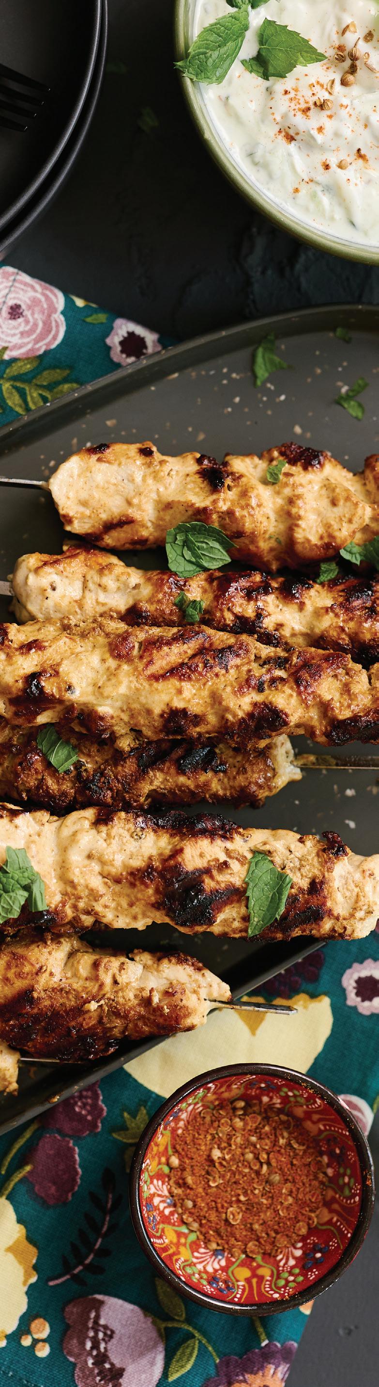 Drain and dry the wooden skewers. Skewer 6 to 8 pieces of chicken onto each kebab stick, and reserve the marinade. Heat the BBQ to medium high. Spray the chicken skewers with oil and season with salt and pepper. Grill the kebabs for 8 to 10 minutes. Halfway through the grilling time, turn the kebabs and brush with the reserved marinade. Discard the marinade; do not brush the marinade at the end of cooking. Serve with the raita sauce.