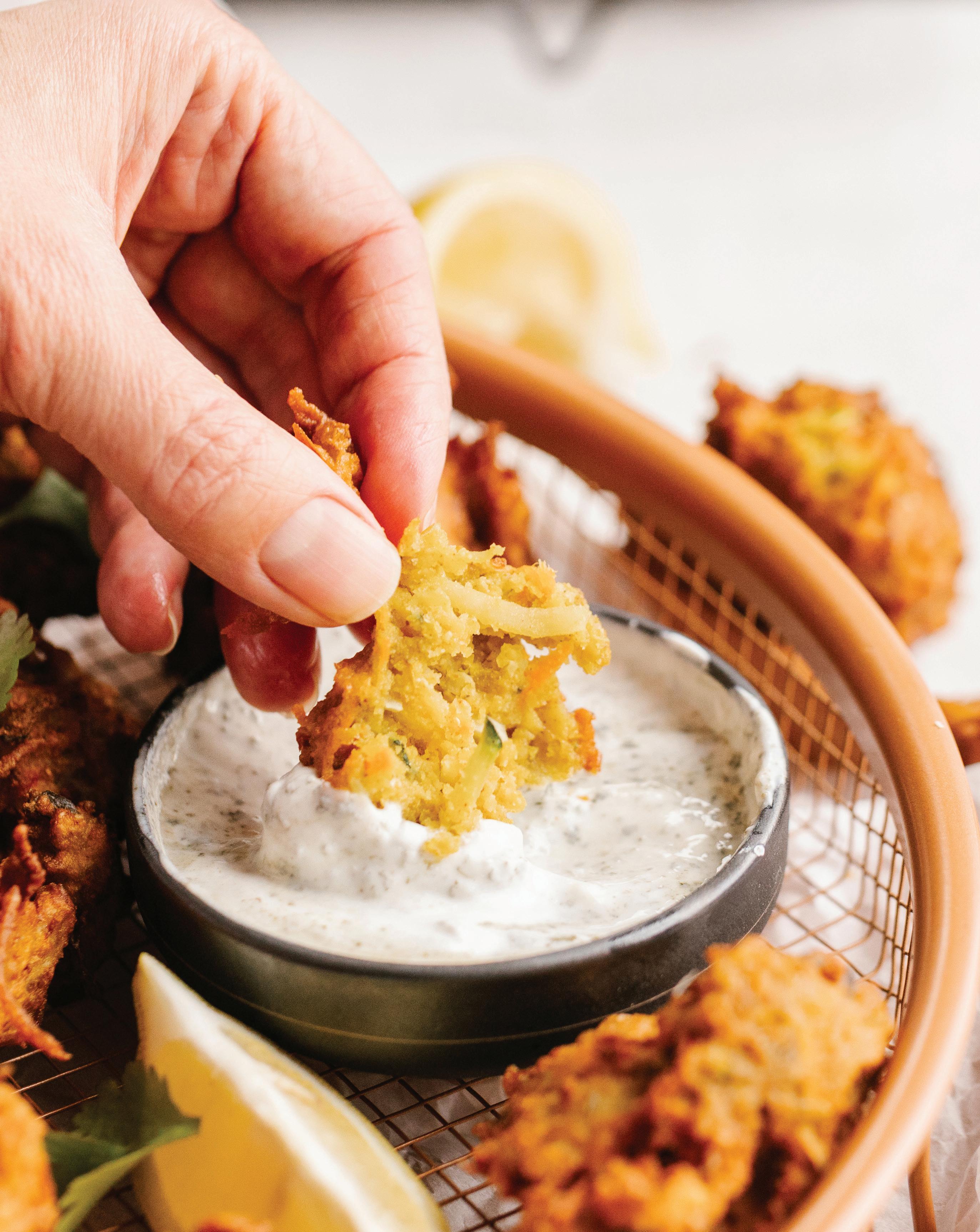 Heat oil in a fryer or pasta pan to 325°F. Using a small ice cream scoop or spoon, scoop fritters one at a time into the fryer. Fry for 3-4 minutes, moving around until each pakora is nice and golden. Remove from the oil and place into a resting tray lined with paper towel. Serve with your favourite dipping sauce, such as sweet chili sauce, minted yogurt, or cilantro mint chutney.