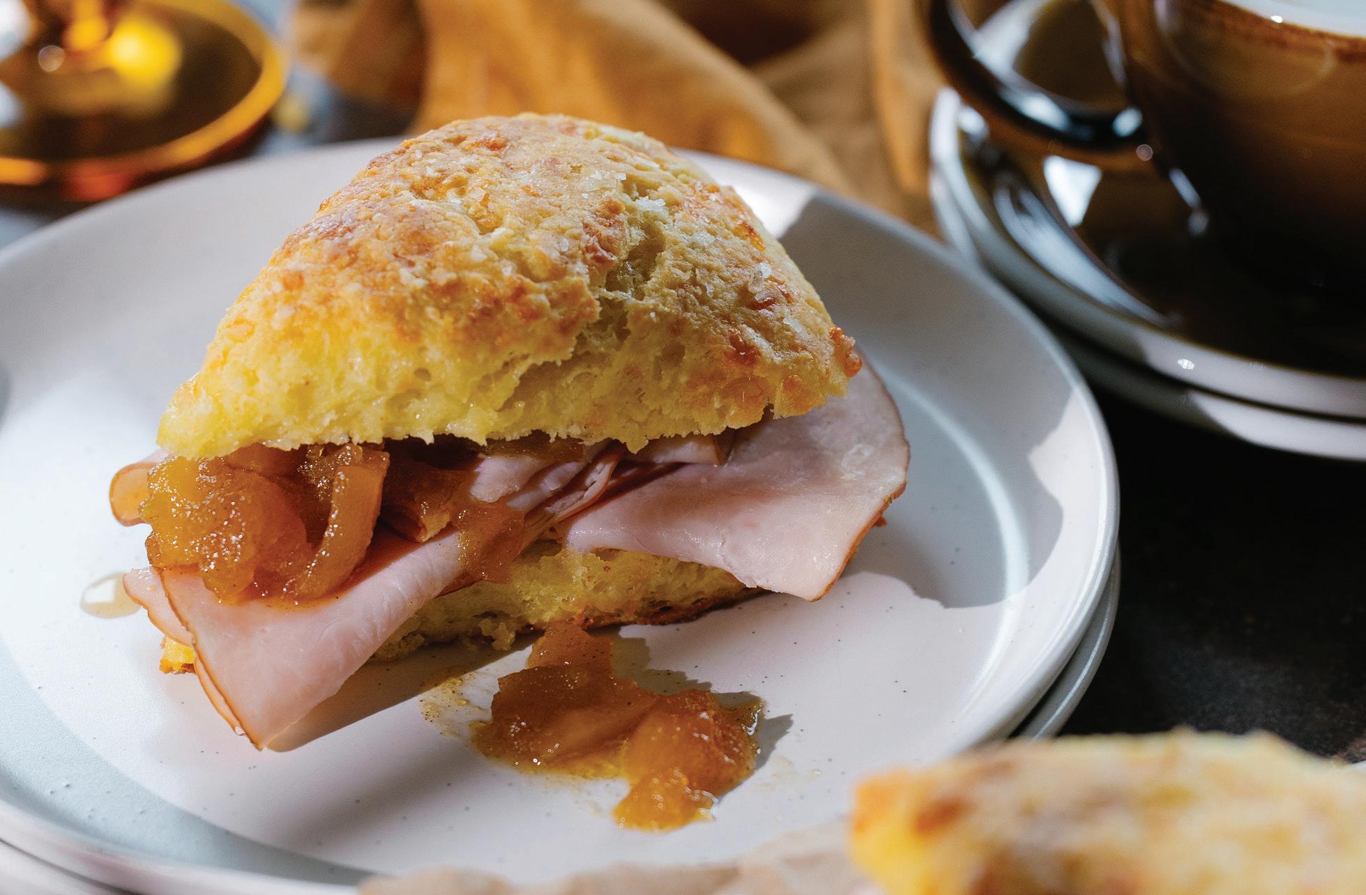 Break open the scone in the middle and place as much shaved ham as you would like, spread the apple sauce on the other and place on platters to serve.
