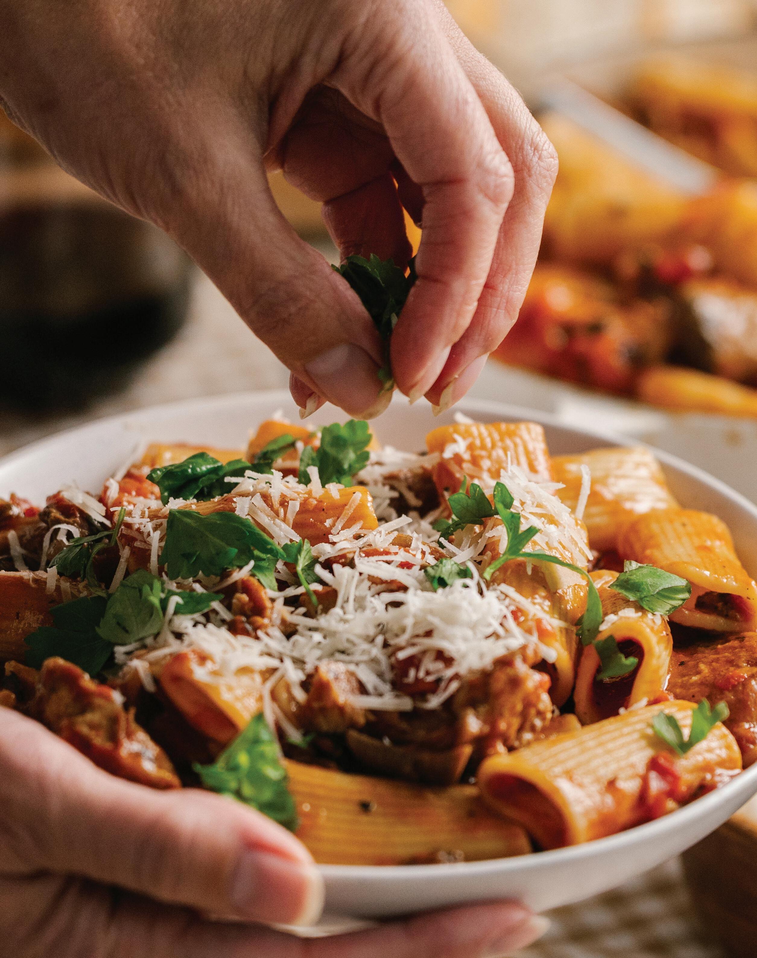 Once veal is seared, move to a Dutch oven. Evenly space out the veal shanks and add the beef stock, tomato sauce, and red wine. Seal with a lid or tin foil and place in the oven. Allow to cook for 2.5 hours, or 3 if the shanks are bigger. Once the veal is done, boil a pot of water for the pasta. Cook pasta al dente. Place the pasta on a plate and top with a shank, cover with the cooking sauce.