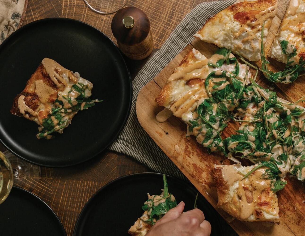 Pre-heat your oven to 400°F. Spread olive oil onto a baking sheet and then place the risen dough in the middle, using your hands work the dough and spread it to the edges, pinch and push the dough into the corner on the tray to make the crust. Spread the cooled cream sauce on the surface of the pizza layer the sliced smoked salmon onto the pizza with the lemon zest and a layer of mozzarella. Place in the oven and cook at 400°F for 15 to 20 minutes until the dough is cooked and it has reached your level of doneness. Remove the pizza from the oven. In a bowl toss the arugula with lemon juice and olive oil and place on top of the pizza. Dress with the black garlic aioli and serve.