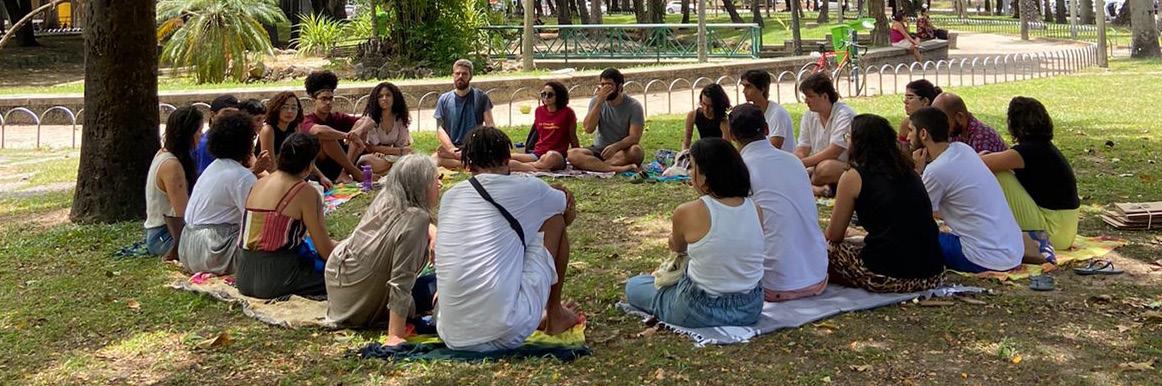 Em 2025, organizamos a nossa roda de estudos em módulos temáticos para cumprir a tarefa de pensar os fundamentos de nossa própria prática clínica na praça e em especial a nossa decisão política e epistêmica de nos manter num horizonte contracolonial. No módulo do primeiro semestre, o tema escolhido foi “a clínica e a psicanálise nos territórios”, aqui discutimos o território enquanto fronteira que delimita, de forma restrita, espaços, língua e cultura, mas também o corpo enquanto